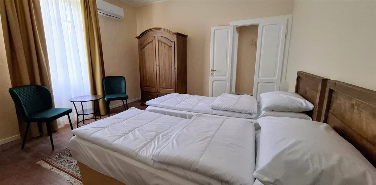 The Suite is 60sqm and consists of 2 bedrooms, one with double bed lake view with safe, and one with 2 single beds garden view. It has a bathroom with shower, double washbasin, hairdryer, and bathrobes. In the living room you will find a comfortable sofa, a small fridge and a TV with satellite channels.